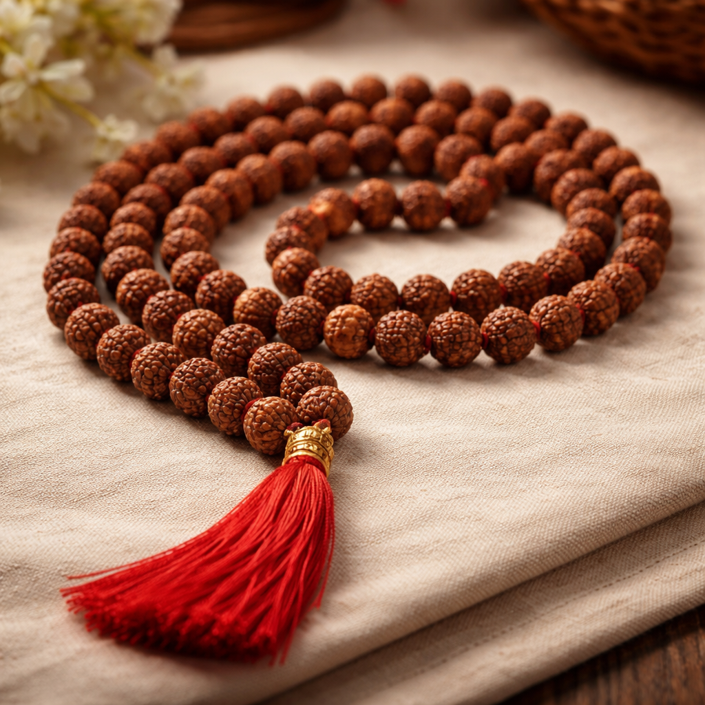 108 Rudraksha Mala is a sacred spiritual accessory made from natural Rudraksha beads, traditionally used for chanting (jaap), meditation, and prayer. Each mala contains 108 beads plus one guru bead, symbolizing spiritual completion and guidance.