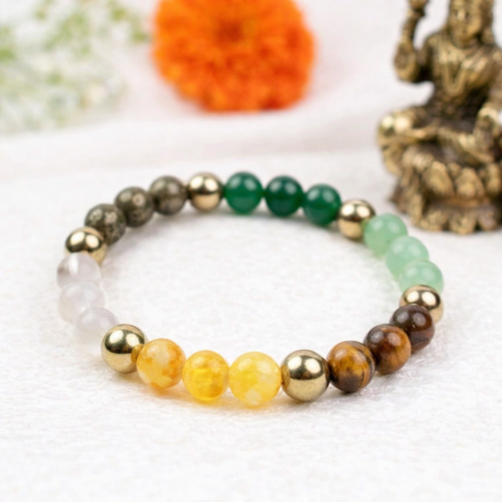 This bracelet includes stones like Amethyst, Green Aventurine, Tiger Eye, Citrine, and more—each known for its unique healing properties. The golden spacer beads add a premium and stylish look, making it perfect for both spiritual use and fashion wear.